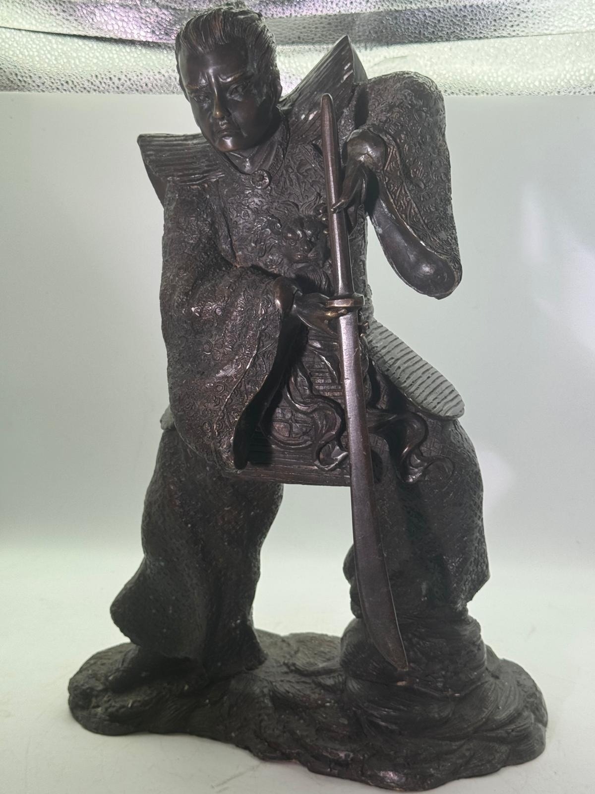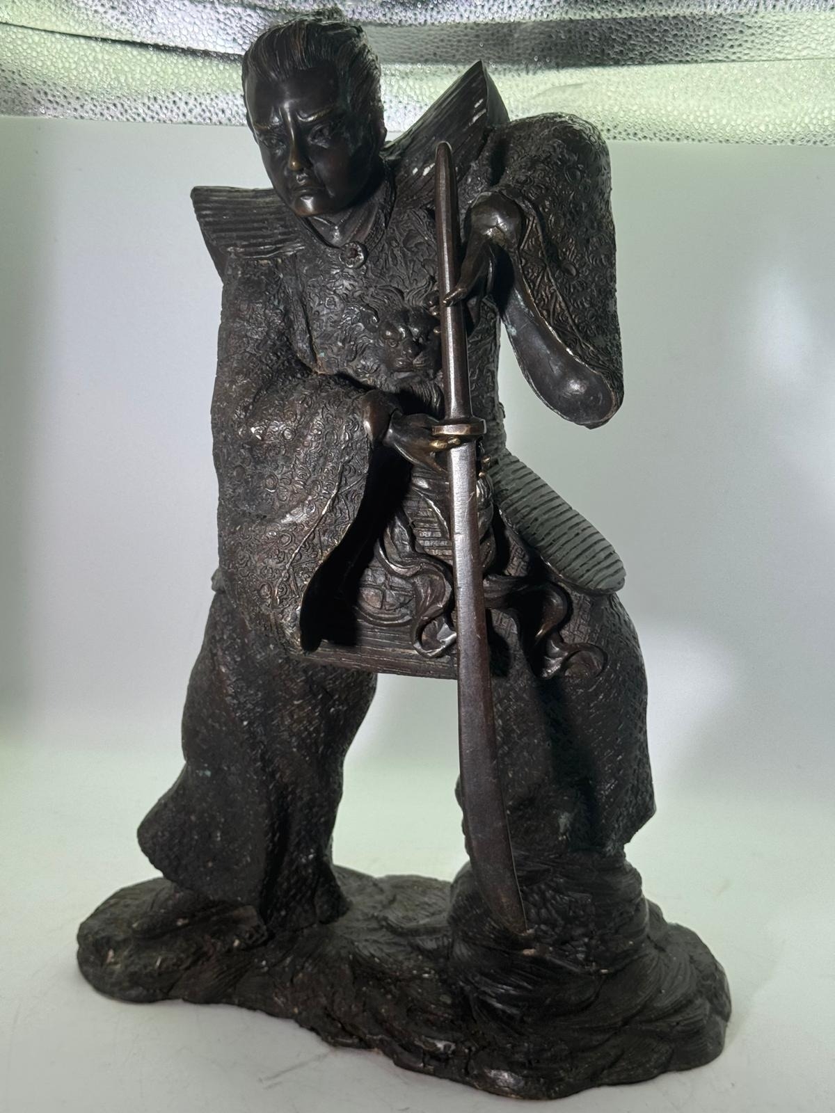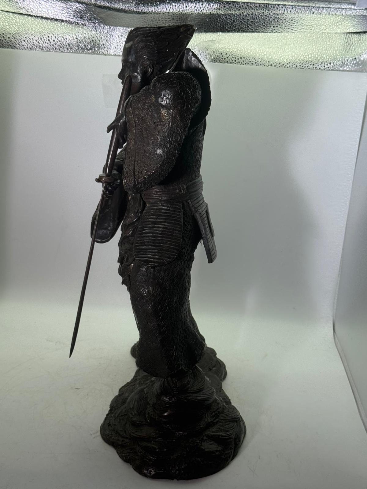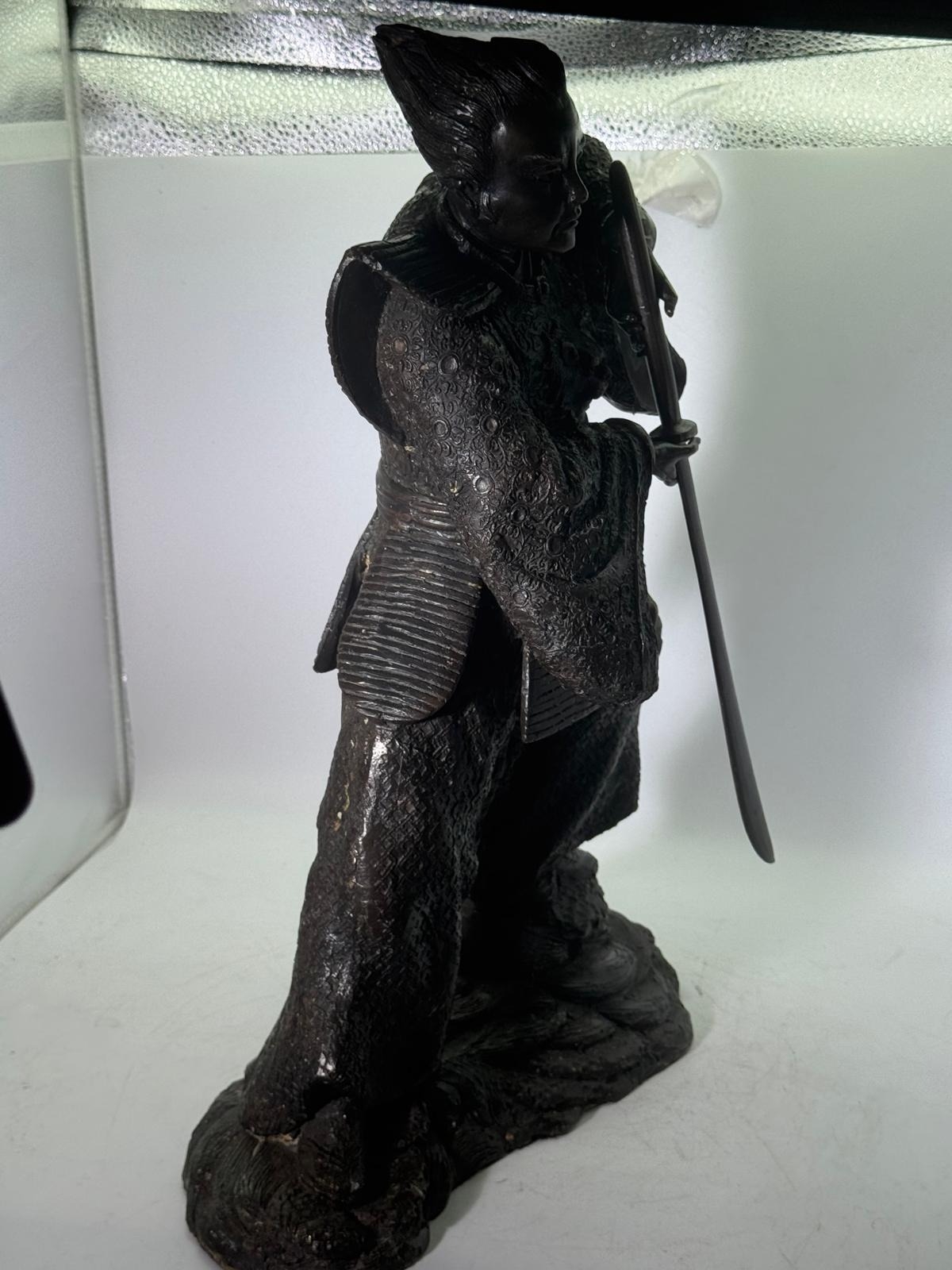 Bronze Figure of a Samurai Warrior, Japanese solidbronze figure depicting a samurai warrior in dynamic standing pose, shown holding a drawn sword with both hands. The figure wears elaborately detailed armour and layered robes, finely decorated with incised patterns, and stands on a naturalistic base. h48 w 33 14kg
