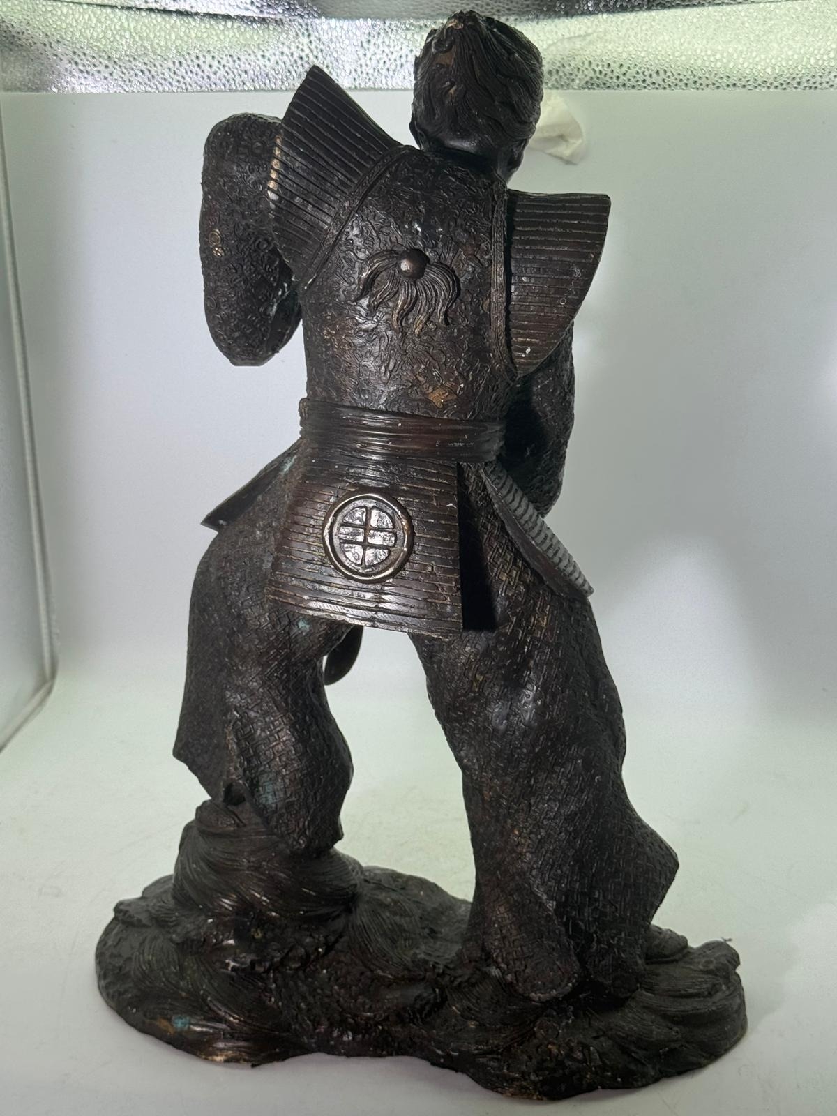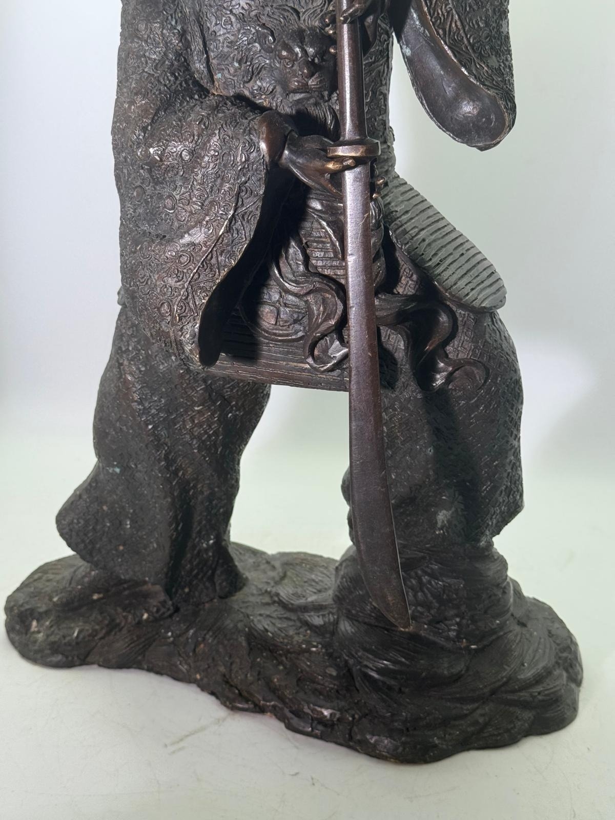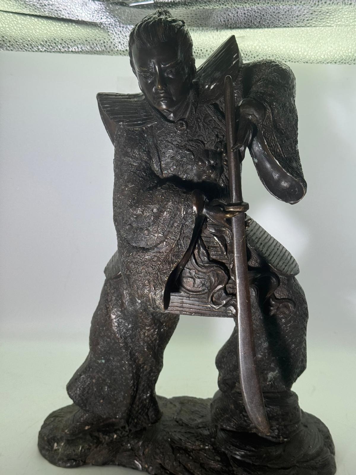 Bronze Figure of a Samurai Warrior, Japanese solidbronze figure depicting a samurai warrior in dynamic standing pose, shown holding a drawn sword with both hands. The figure wears elaborately detailed armour and layered robes, finely decorated with incised patterns, and stands on a naturalistic base. h48 w 33 14kg