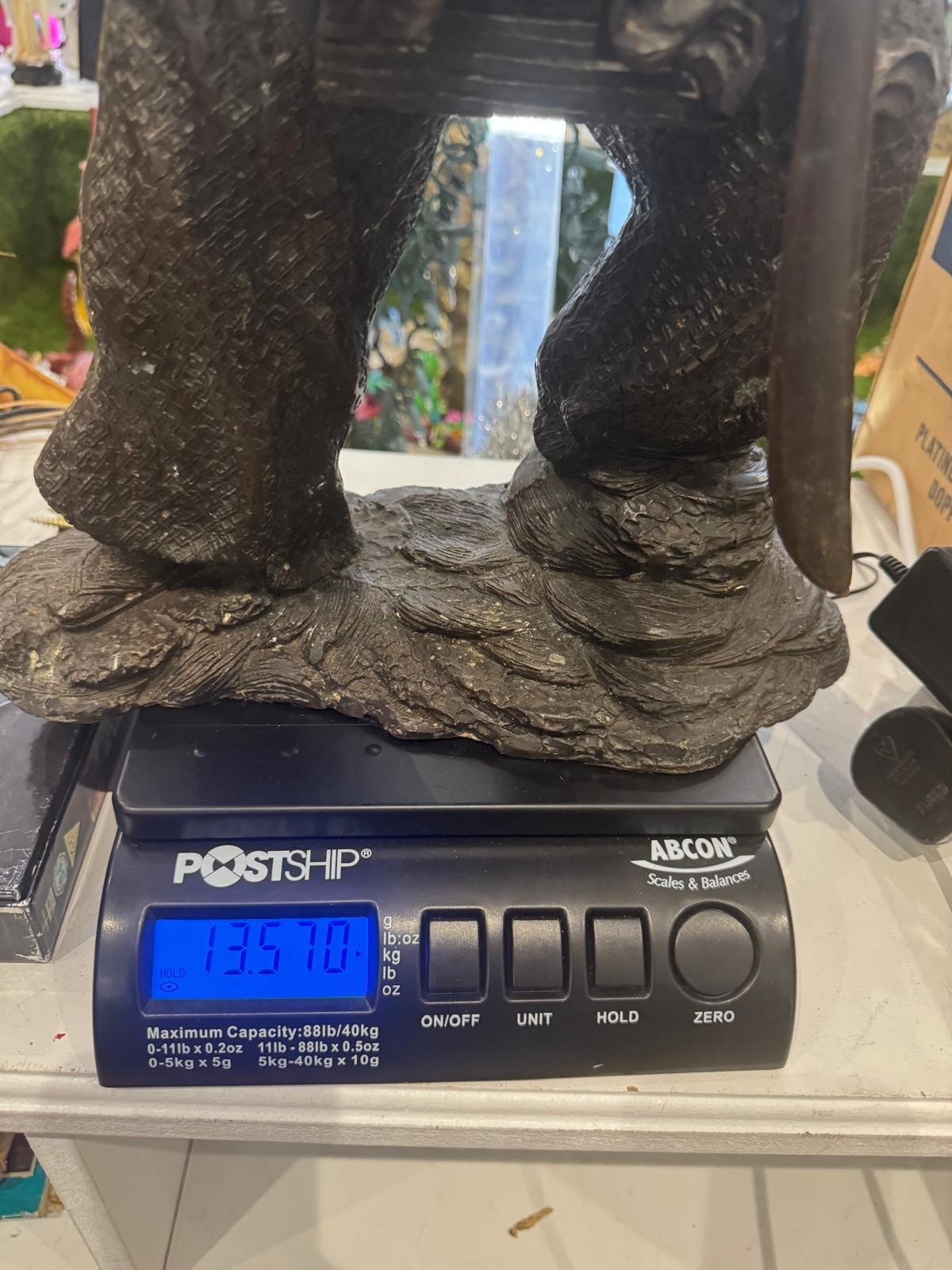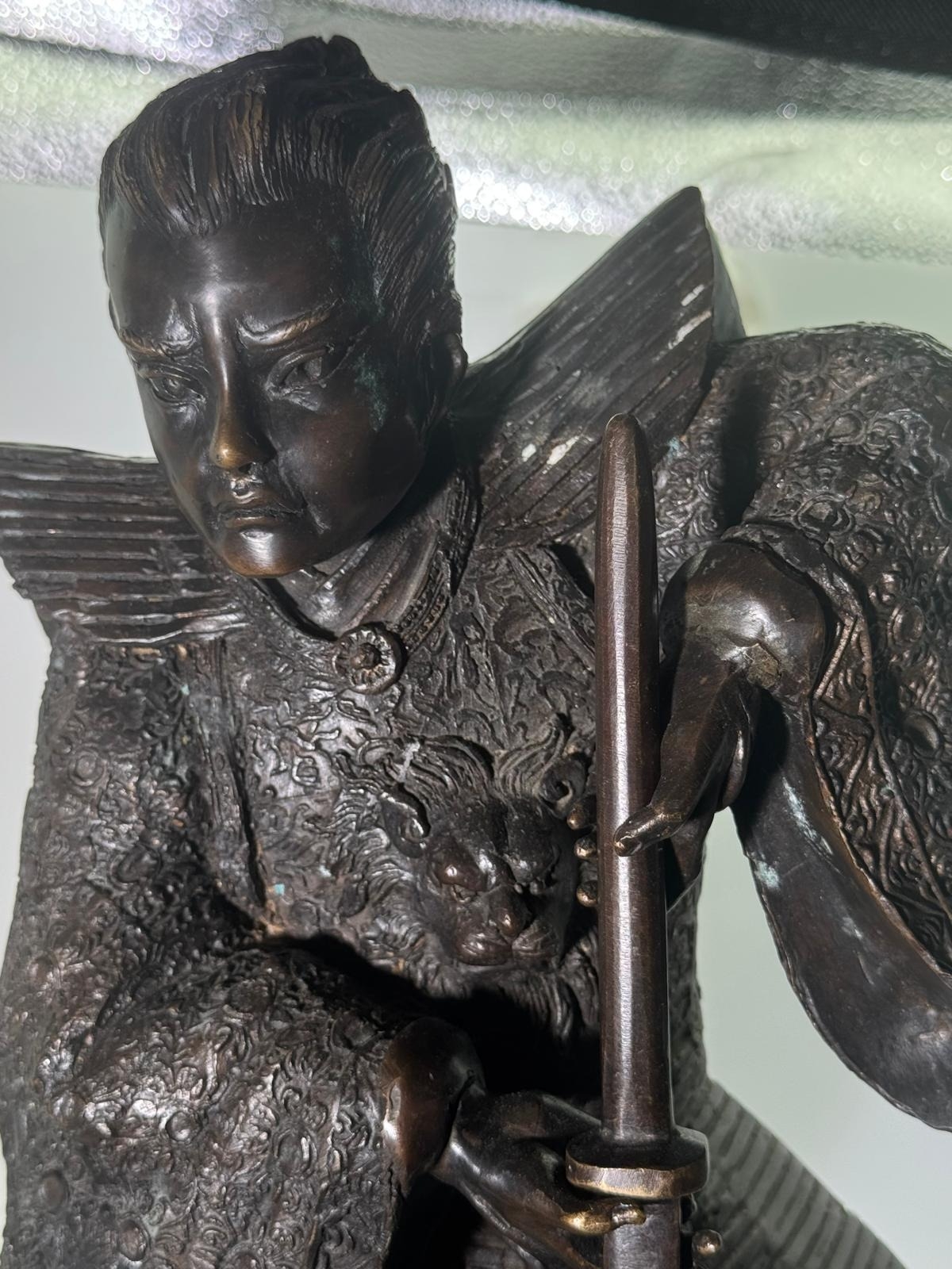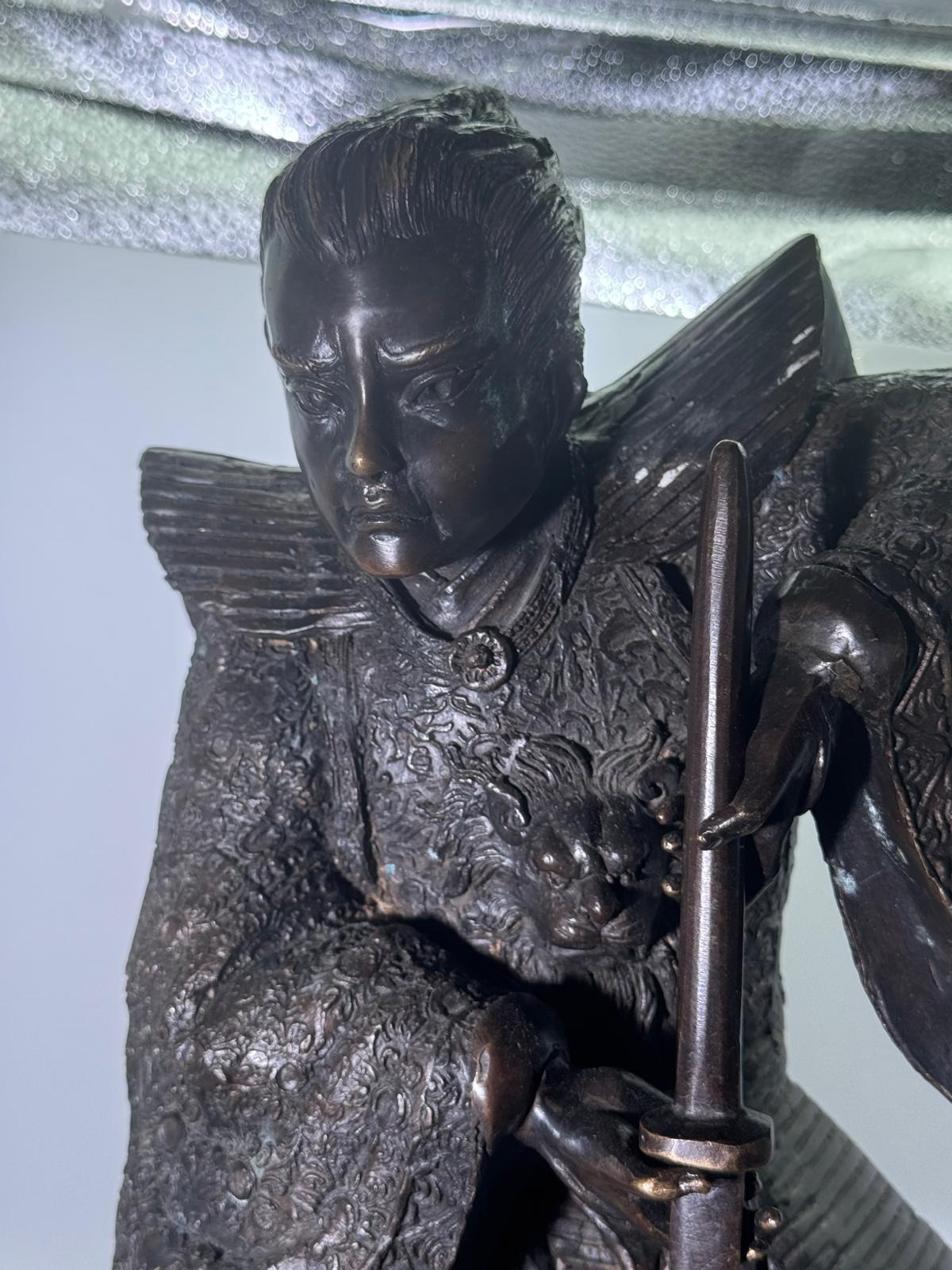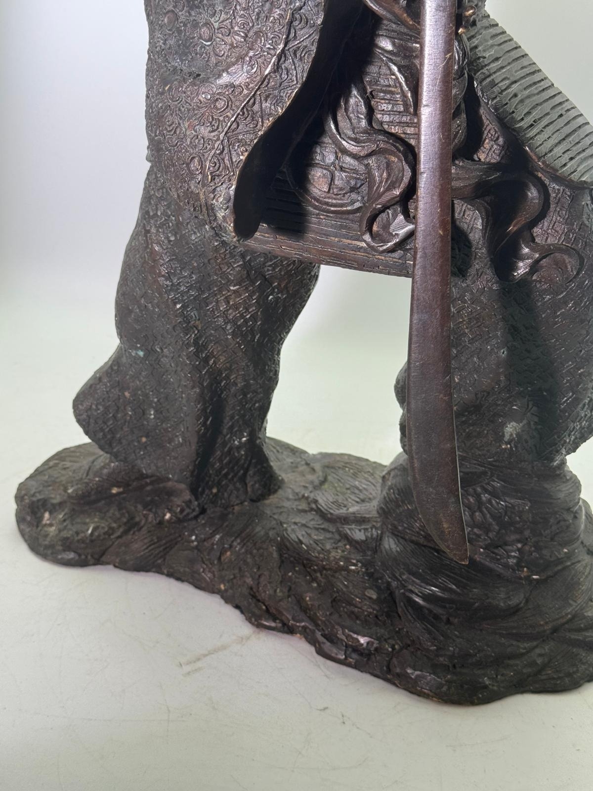 Bronze Figure of a Samurai Warrior, Japanese solidbronze figure depicting a samurai warrior in dynamic standing pose, shown holding a drawn sword with both hands. The figure wears elaborately detailed armour and layered robes, finely decorated with incised patterns, and stands on a naturalistic base. h48 w 33 14kg