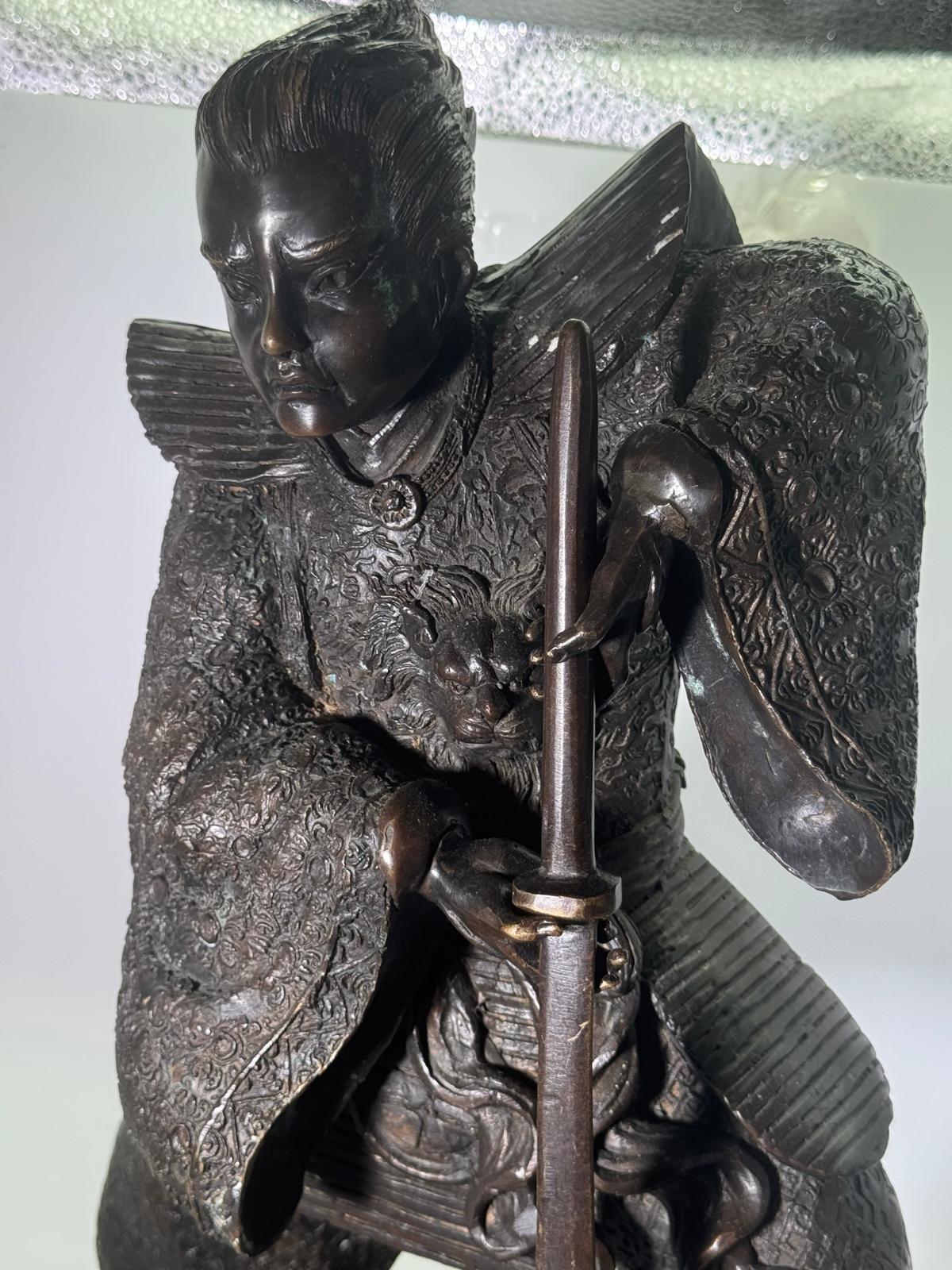 Bronze Figure of a Samurai Warrior, Japanese solidbronze figure depicting a samurai warrior in dynamic standing pose, shown holding a drawn sword with both hands. The figure wears elaborately detailed armour and layered robes, finely decorated with incise