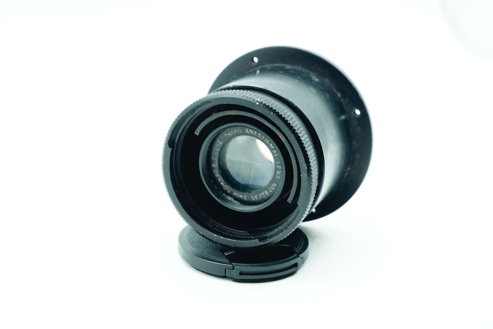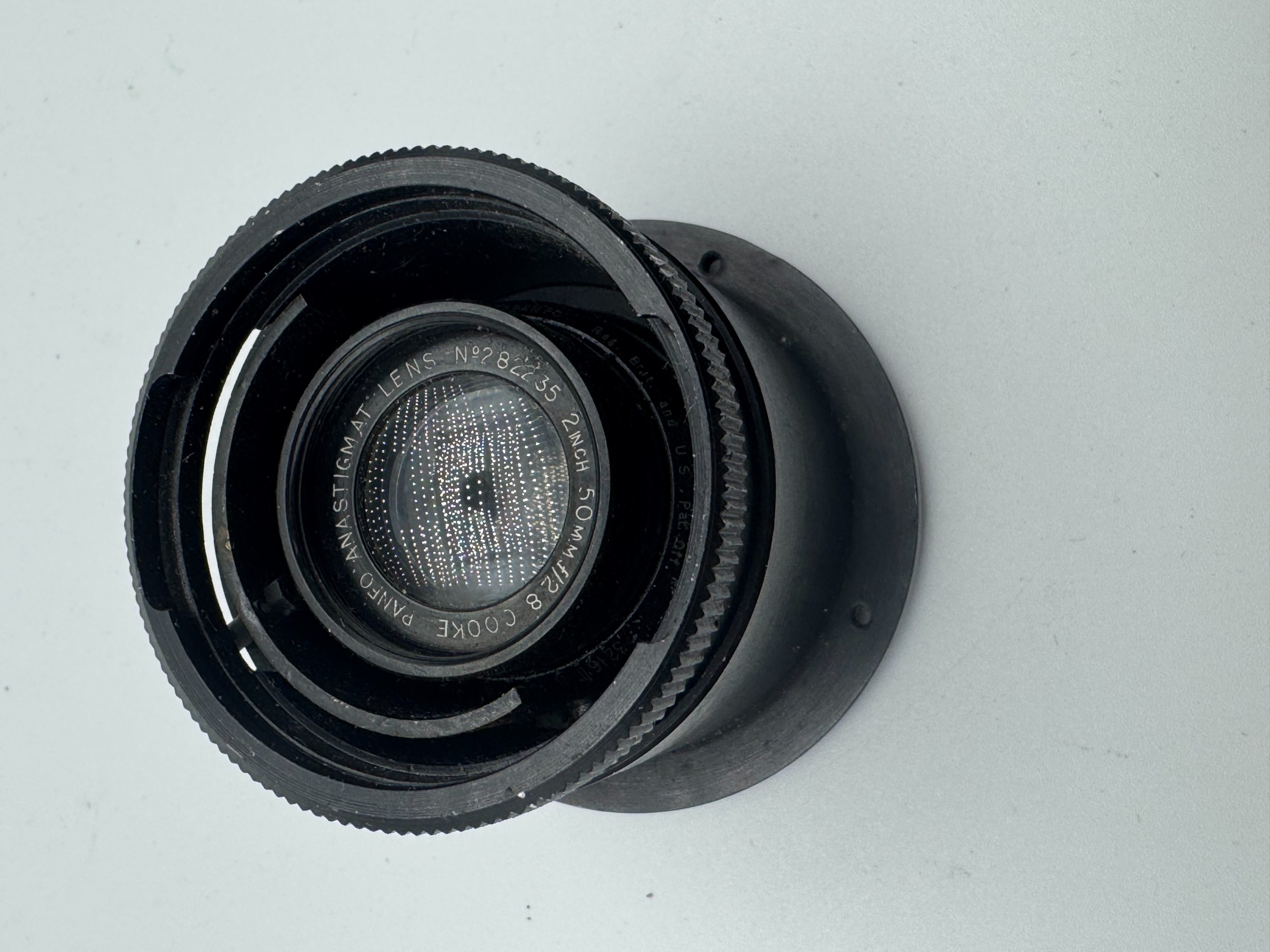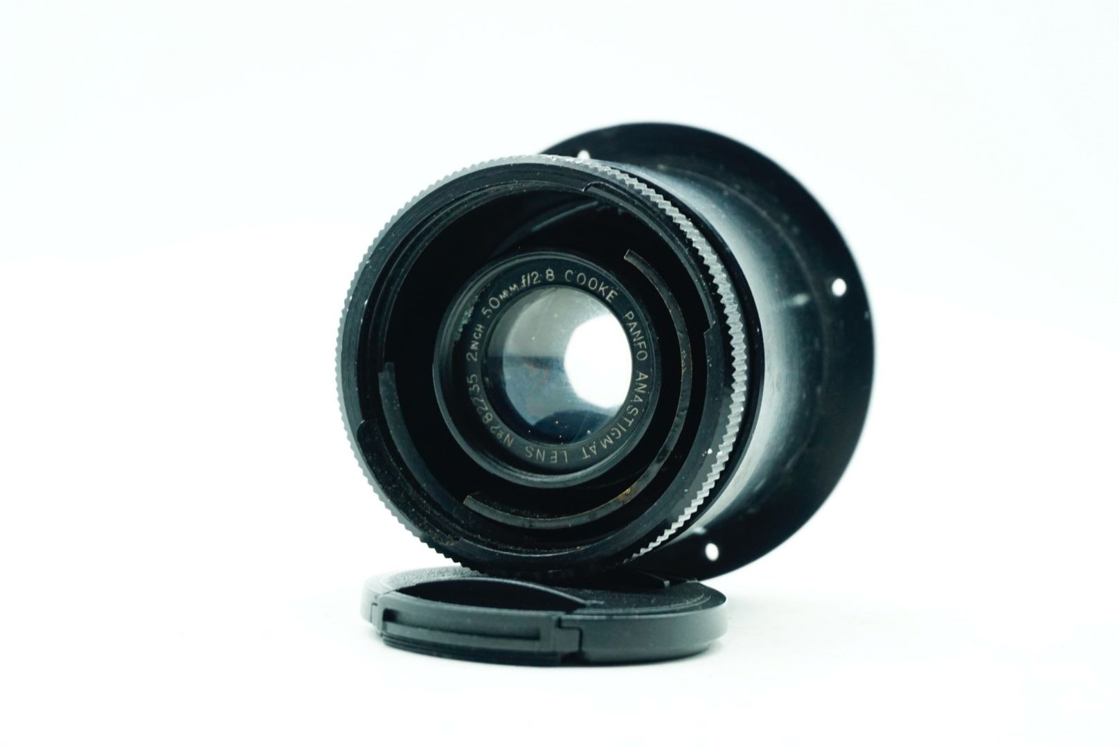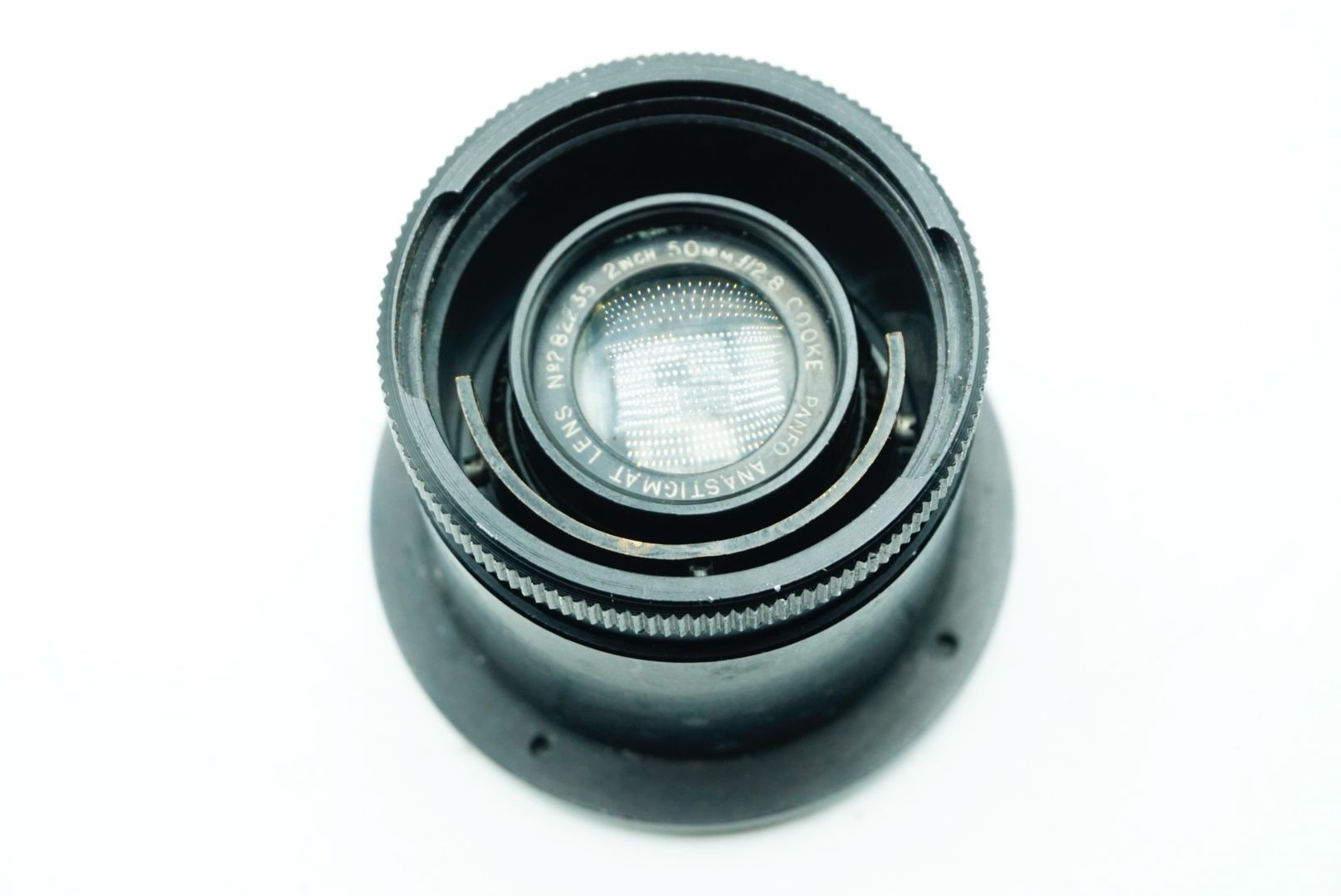 A Taylor Hobson Cooke Panfo f/2.8 50mm “War Finish” lens s/n 282235 a classic motion-picture optic produced by Taylor, Taylor & Hobson (Cooke) of England. The Panfo war finish series was designed to deliver consistent sharpness, controlled contrast, and reliable performance for professional film production, and today these lenses are valued for both their historical importance and distinctive vintage rendering. ; black, serial No 282235, body, VG, front elementlight haze . rear element clear/aperture smooth minimal dust