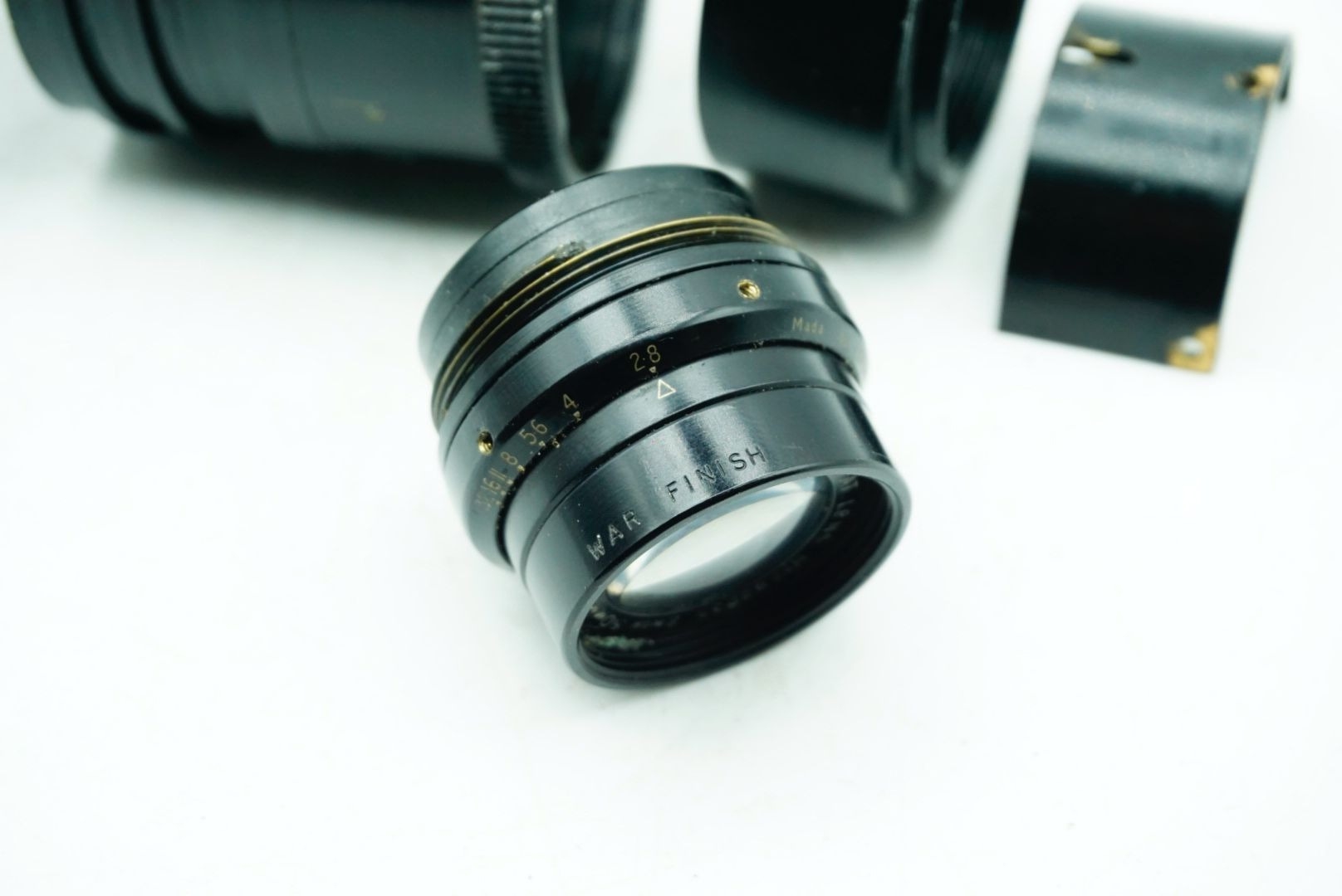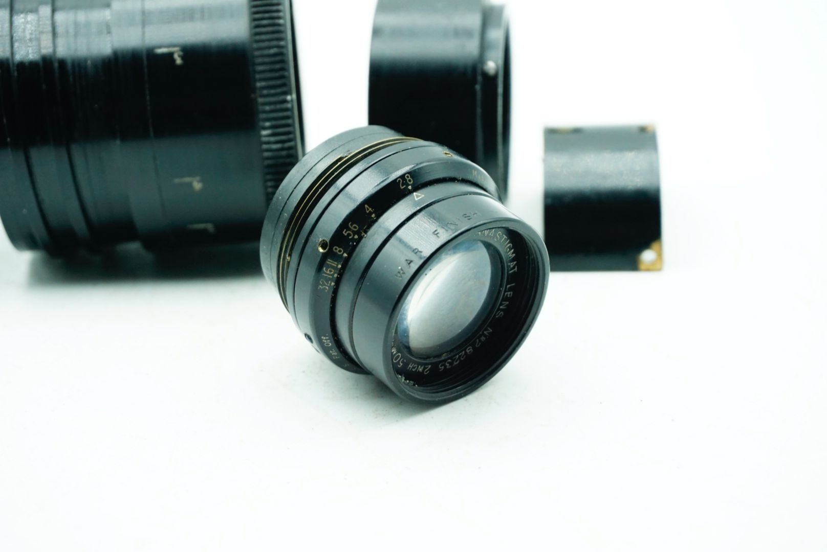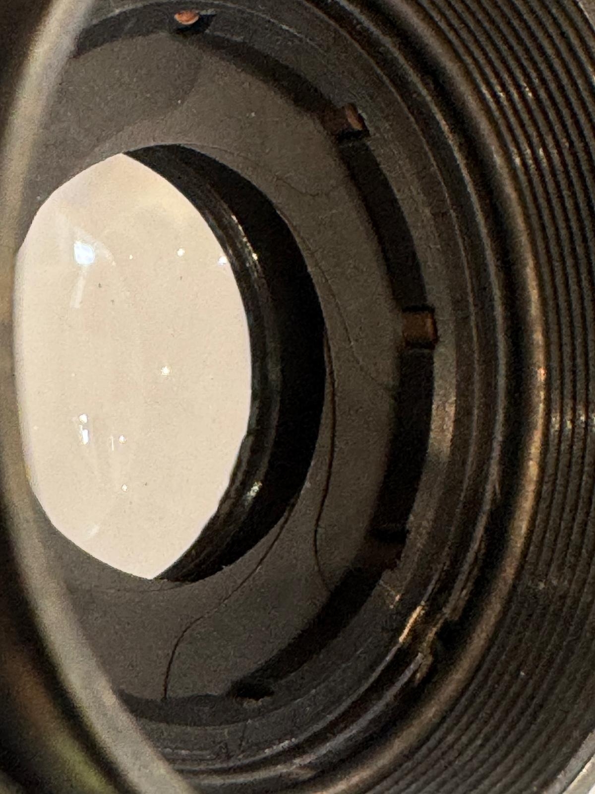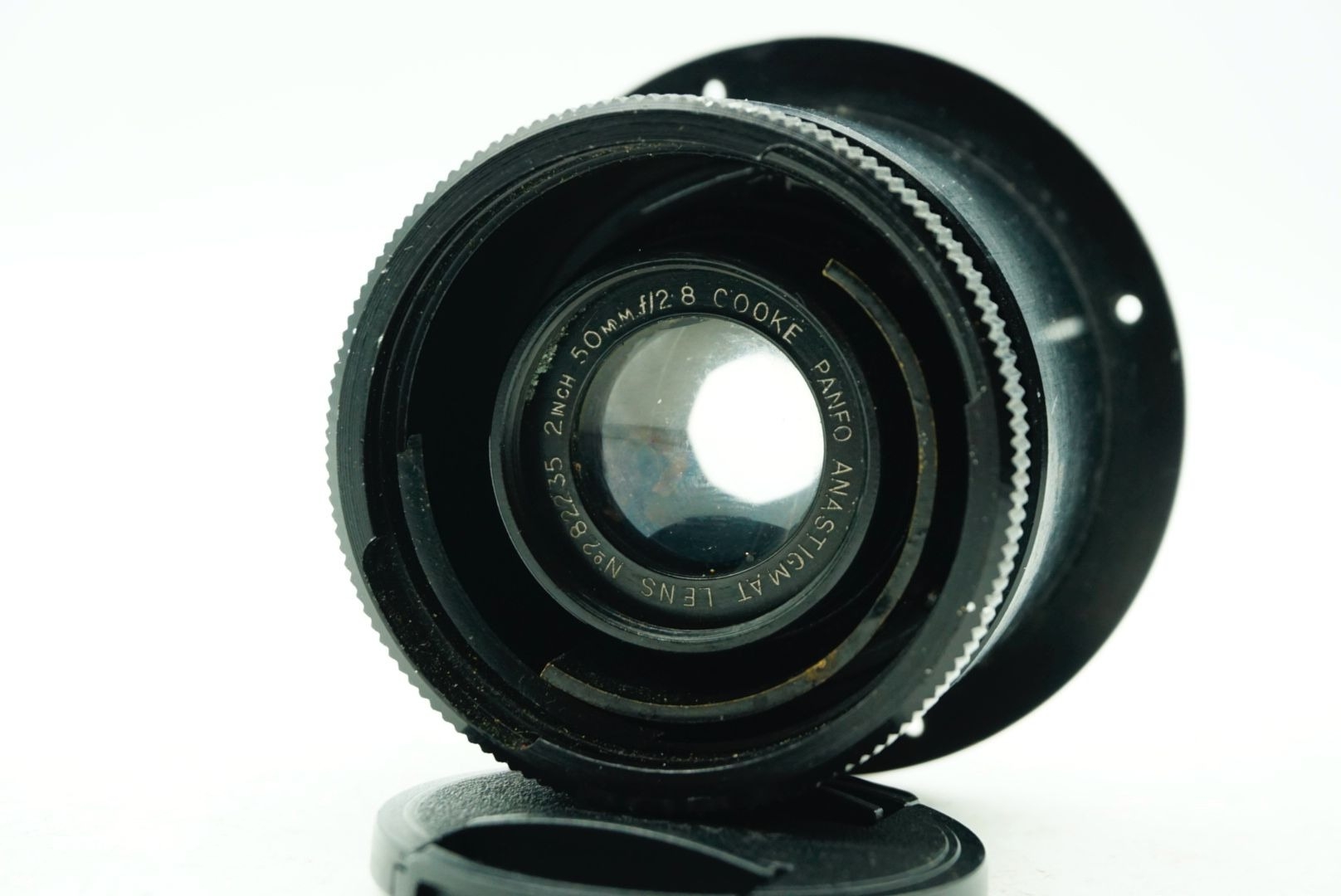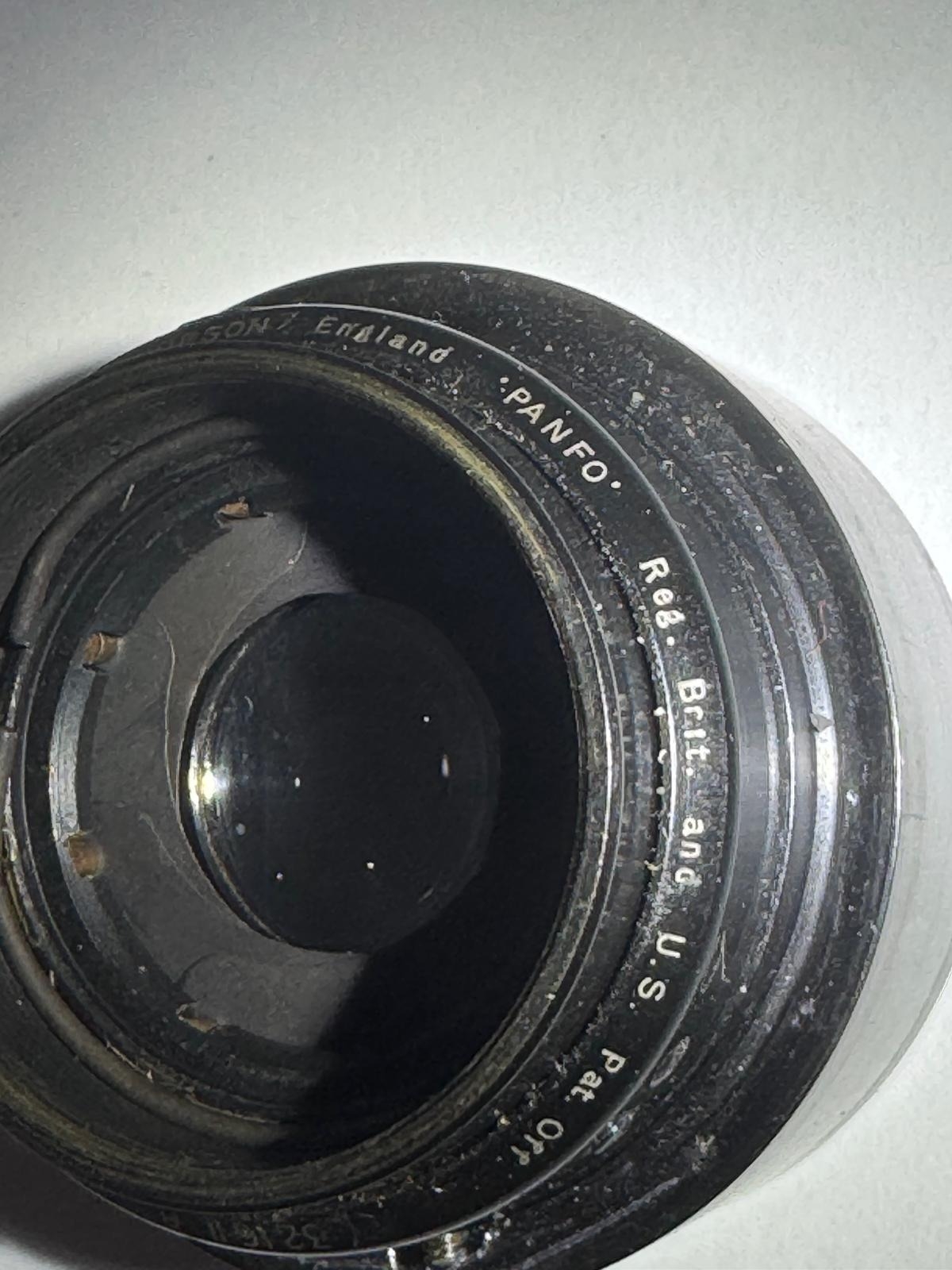 A Taylor Hobson Cooke Panfo f/2.8 50mm “War Finish” lens s/n 282235 a classic motion-picture optic produced by Taylor, Taylor & Hobson (Cooke) of England. The Panfo war finish series was designed to deliver consistent sharpness, controlled contrast, and reliable performance for professional film production, and today these lenses are valued for both their historical importance and distinctive vintage rendering. ; black, serial No 282235, body, VG, front elementlight haze . rear element clear/aperture smooth minimal dust